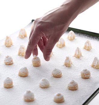 una volta raffreddato, coppare un disco del diametro di 16 cm, cospargere di PRALIN DELICRISP PISTACCHIO e abbattere di temperatura